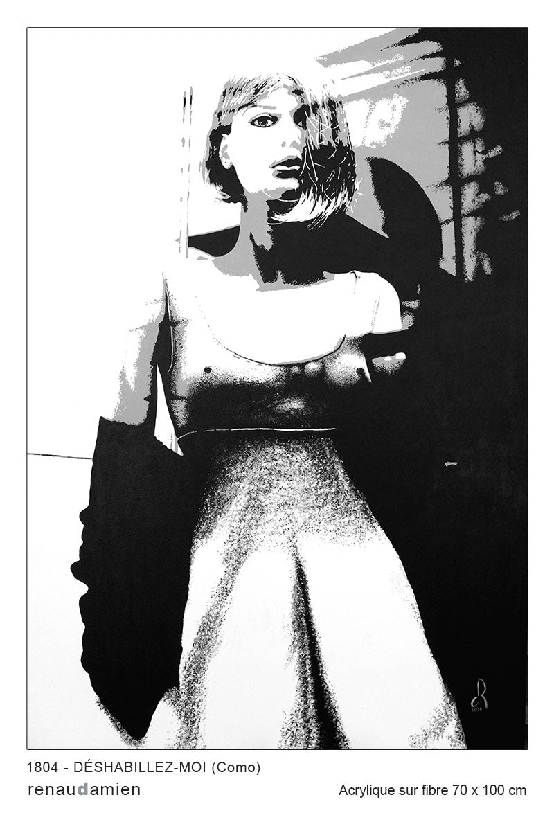 Dans "Déshabillez-moi", peinture réalisée en 2018 à Como, l'artiste revisite la figure du mannequin pour en faire un puissant éloge de la féminité. Le noir et blanc crée une atmosphère à la fois mystérieuse et épurée, révélant une réflexion profonde sur l'essence même de la femme. Une œuvre qui capture à la perfection l'équilibre entre force et vulnérabilité.
