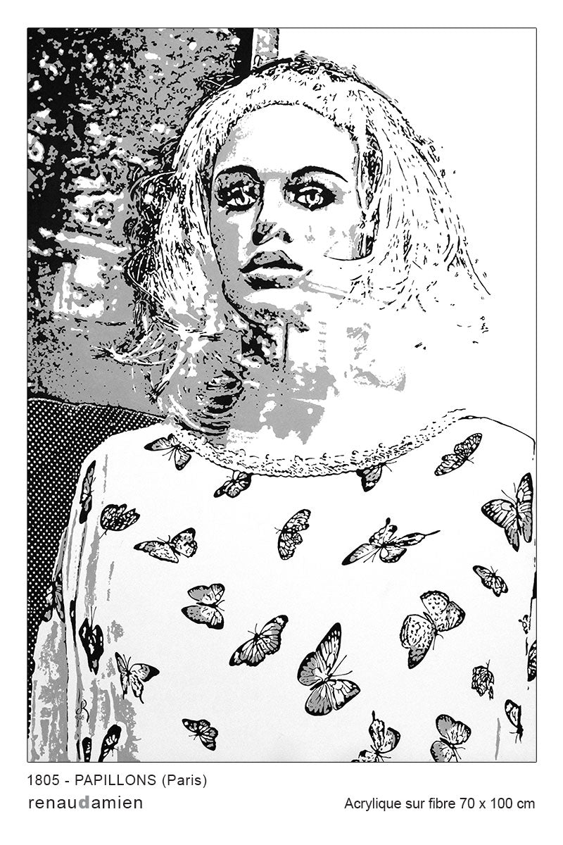 Papillons (2018) est une peinture en noir et blanc qui évoque la légèreté apparente d’une femme entourée de papillons, tout en révélant un sous-texte de doute et de questionnement. Les papillons symbolisent à la fois l'évasion et l'incertitude face à la transformation. La silhouette féminine, enveloppée de ces créatures volatiles, reflète une introspection profonde, un voyage intérieur où légèreté et incertitude se croisent. Le regard de la femme semble chercher des réponses, capturant un instant suspendu entre la fragilité de l’instant et la quête de sens.
